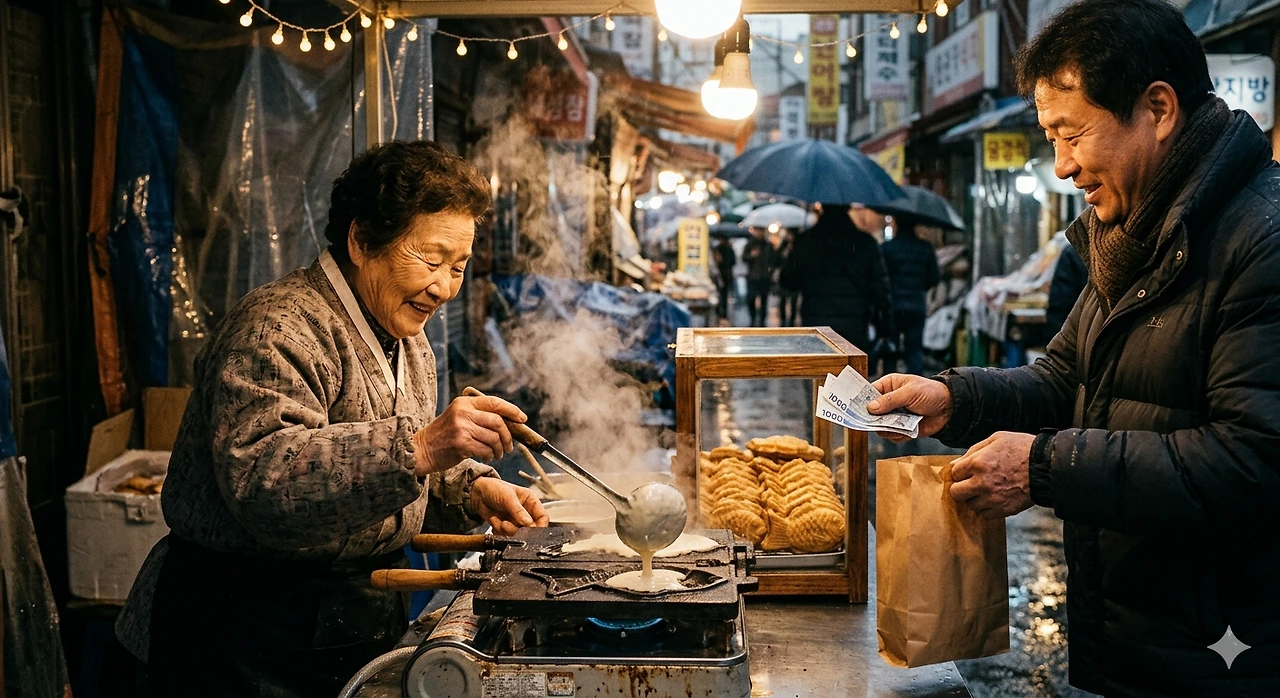 하지만 시장통 붕어빵 노점 앞에 서는 순간, 이 현대적 질서는 잠시 작동을 멈춘다. 이곳은 여전히 '현금'이라는 구시대적 유물이 힘을 발휘하는 성역이다. 코트 안주머니 깊숙한 곳, 세탁소에 맡기기 전 우연히 발견했거나 혹은 오늘을 위해 일부러 챙겨두었던 꼬깃꼬깃한 천 원짜리 지폐 세 장. 나는 이 '가슴 속 삼천 원'을 단순한 비상금이 아니라, 겨울을 나기 위한 최소한의 존엄이자 실존적 보험이라 부르고 싶다.
