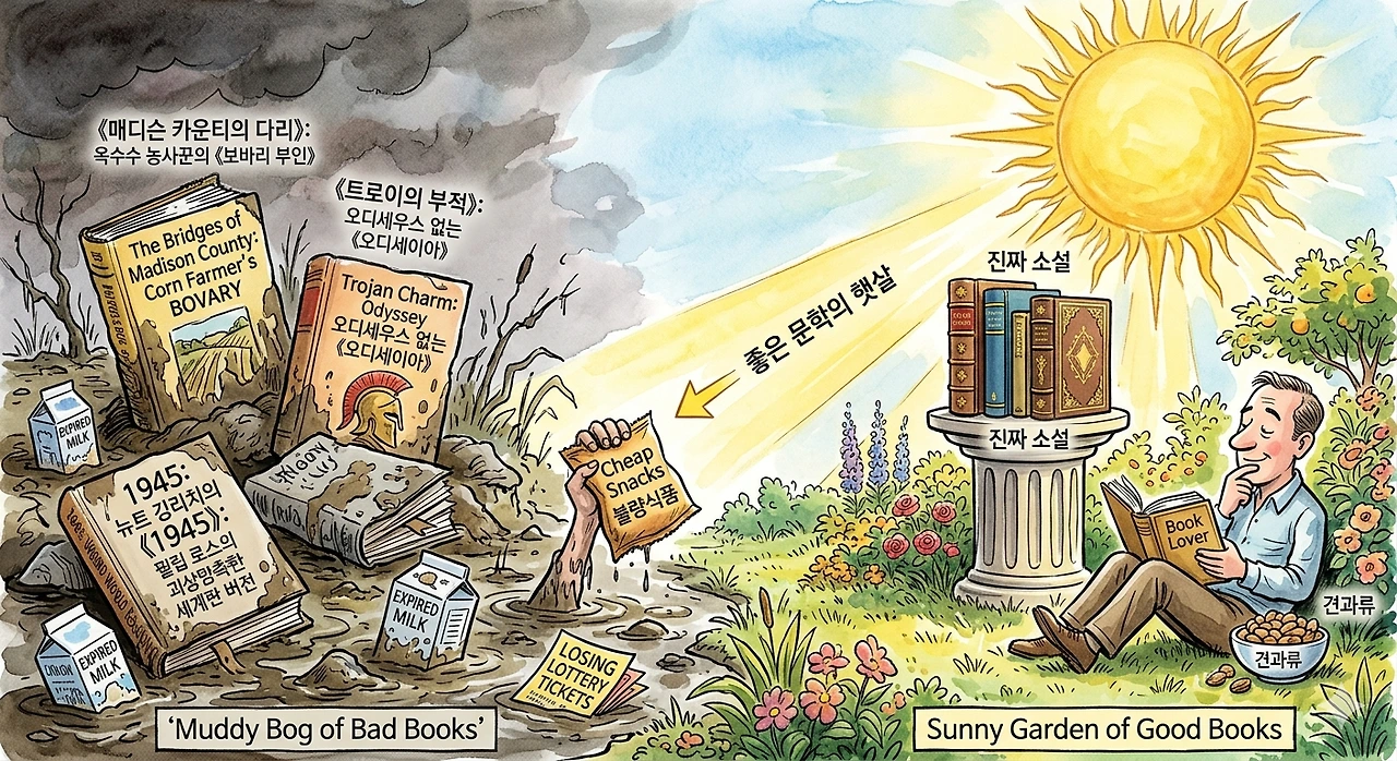 조 퀴넌은 그의 저서 《아직도 책을 읽는 멸종 직전의 지구인을 위한 단 한 권의 책》에서 나쁜 책을 향해 거침없는 독설을 내뱉는다. 그는 "나쁜 책은 정말 나쁜 책"이라는 확고한 시각을 고수하면서도, 역설적으로 그 형편없음이 존재하기에 좋은 책들이 더욱 돋보인다고 말한다. 나쁜 소설을 "좋은 소설의 단물 다 빠진 버전" 혹은 "진흙탕"에 비유하는 그의 문장들은 매섭다. 옥수수 농사꾼의 《보바리 부인》이 되어버린 《매디슨 카운티의 다리》나, 오디세우스가 실종된 《오디세이아》 같은 《트로이의 부적》을 보며 우리는 비로소 문학의 햇살이 그리워지기 때문이다. 하지만 그는 이 냉소의 끝에 묘한 여지를 남긴다. "때로는 견과류가 당기지만, 때로는 그렇지 않다"는 그의 말처럼, 우리에겐 가끔 그 형편없는 '불량식품' 같은 문학이 필요한 순간이 있기 때문이다.