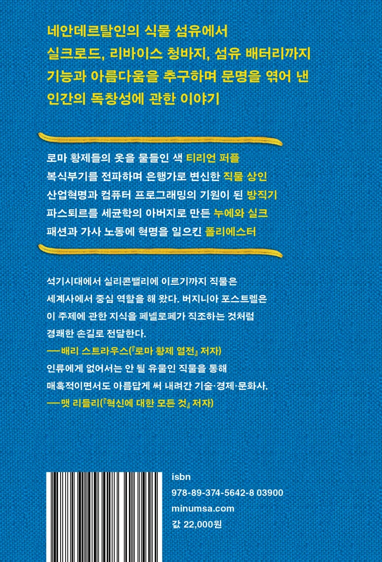 《패브릭은》 특정 사물이나 관념을 주조로 문명사를 기술하려는 일련의 흐름과 궤를 같이한 작품이다. 버지니아 포스트렐은 “직물 원료나 제작자, 시장 등 문명의 특성이나 발전에 큰 영향을 끼친 요소”를 씨줄로 삼아 베틀에 올려놓았다. 날줄은 섬유, 실, 직물, 염료, 상인, 소비자, 혁신자였다. 베는 씨줄과 날줄을 엇갈려가며 짠다. 주의를 등한히 하거나 엄두가 나지 않는 일을 하면 자칫 성긴 옷이 되기 십상이다. 좋은 베일수록 씨줄과 날줄이 공교히 엮여있어야 한다. 직물이 문명사의 한 축을 차지하는 이유에 관해 이보다 설득력 있는 진술이 있을까 싶은 문장을 소개한다. 물론 저자가 썼다. “우리가 석기시대로 부르는 시기는 사실 끈 시대로 불러도 무리가 없다. 선사시대의 이 두 가지 기술은 말 그대로 서로 엮여있기 때문이다. 초기 인류는 돌도끼에 끈으로 손잡이를 묶어 도끼와 창을 만들었다.” 이제 겨우 10여 장을 읽었을 뿐이다. 설득은 진즉 당했고 이제 끌려갈 일만 남았다.