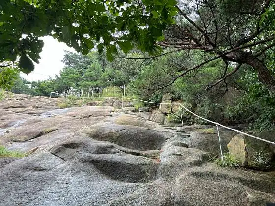 가는 길 내내 너른 바위가 쉴 곳을 만들어 주는가 하면 좁은 산길에 중앙을 비집고 들어온 가지들이 치기가 발동했는지 툭툭 어깨를 치는 정다운 모습이 지천이다. 토양 유실을 막으려는 고육지책이겠지만 덱 형태로 조성한 계단만큼은 적응이 쉽지 않다.