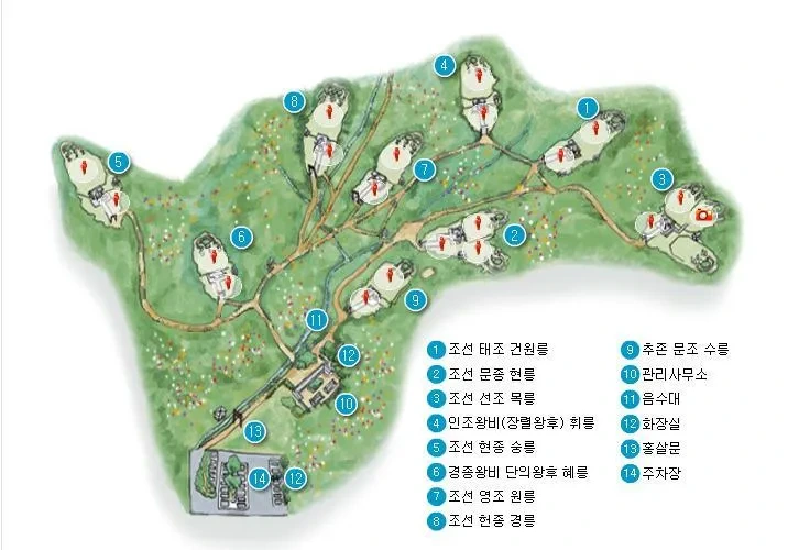 조금 더 언급하면 건원릉은 조선 태조의 무덤이다. 현릉은 문종과 현덕 왕후, 목릉은 선조와 의인 왕후 및 계비 인목 왕후, 휘릉은 인조 비 장렬 왕후, 숭릉은 현종과 명성 왕후, 혜릉은 경종 비 단의 왕후, 원릉은 영조와 계비 정순 왕후, 수릉은 문조와 신정 왕후, 경릉은 헌종과 효현 왕후 및 계비 효정 왕후의 무덤이다.