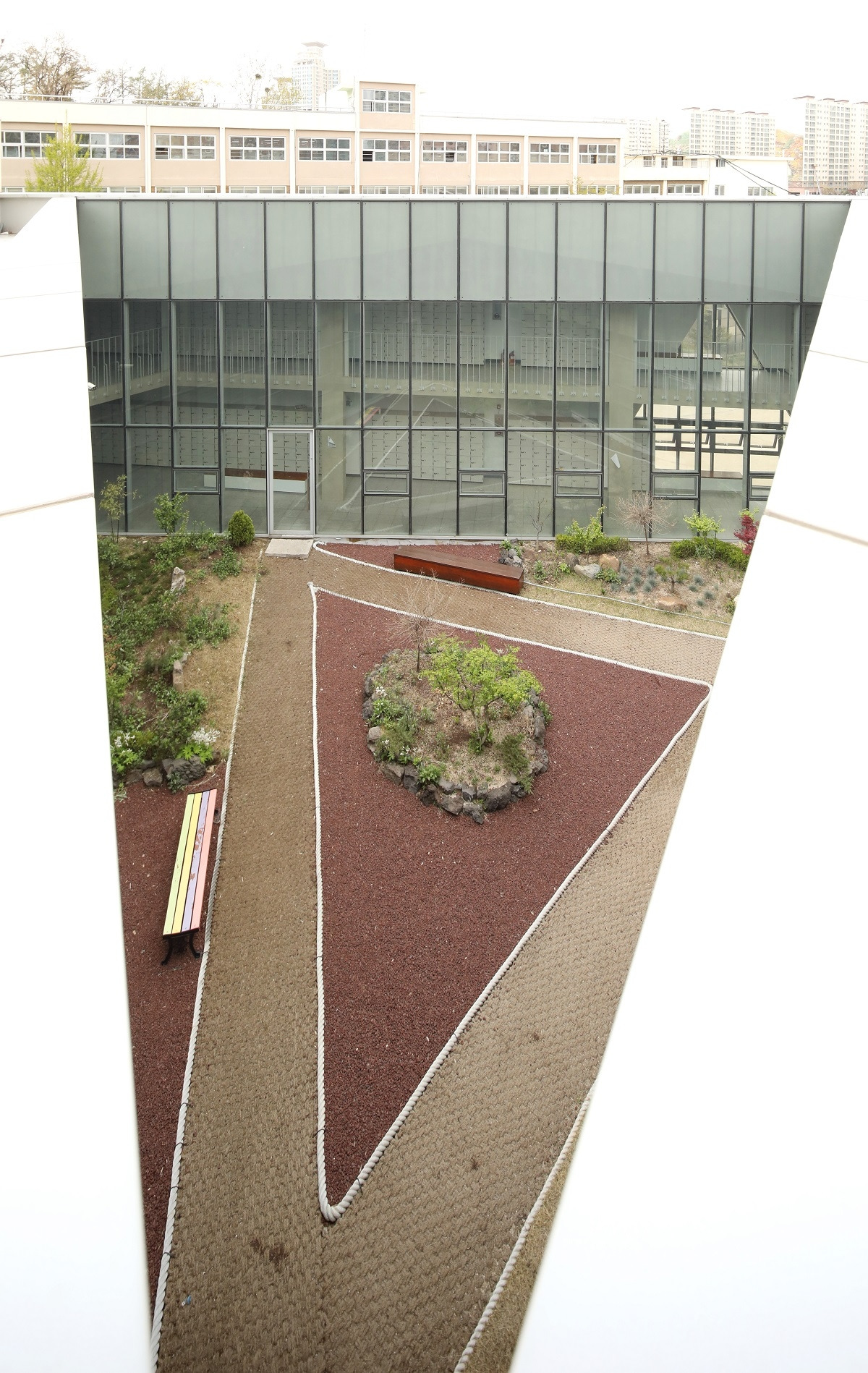 삼각학교의 더 강렬한 차별성은 ‘삼각형 내 삼각형’으로 조성된 중정(中庭)에서 찾을 수 있다. 삼각학교 1층에는 교무실과 2개의 이동수업실, 그리고 강당으로도 쓰이는 다목적 학습실이 있고 3학년 교실 14개는 2, 3층에 몰려 있다. 이들 교실이 바깥 면을 따라 설치됨에 따라 복도 역시 삼각 형태로 조성됐다. 그 안쪽으로 옥상까지 트여 하늘이 보이고 쏟아지는 햇빛을 받아 어두운 복도를 환하게 비추는 중정을 설치한 것이다.