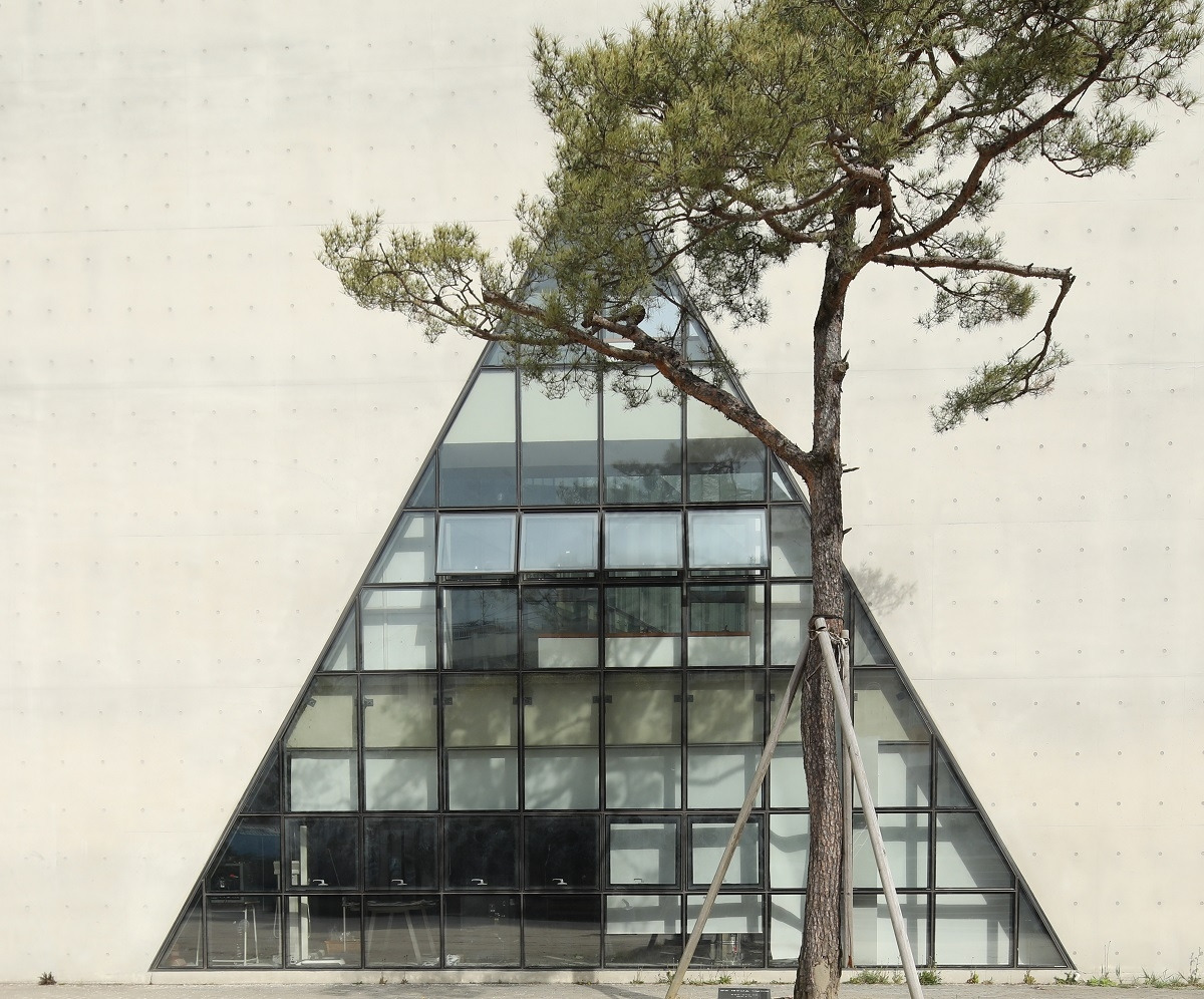 건축에서 삼각형은 아주 이례적인 경우에만 쓰인다. 그런데 그 보수적인 대한민국 학교 건물에 삼각형 건축이 세워졌다는 말에 깜짝 놀랐다. 경기 남양주시 도농동 동화고 내 고3 학생의 학습동 ‘송학관(松鶴館)’이다.