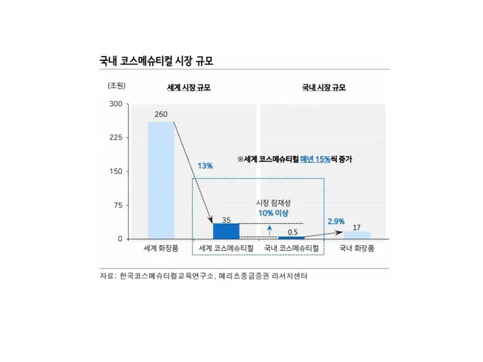 2015년 전 세계 코스메슈티컬 시장은 40조 원을 돌파했고 전체 화장품 시장의 13%를 차지했다고 합니다. (자료: 한국코스메슈티컬교육연구소) 이에 반해 국내 코스메슈티컬 시장은 5,000억에 머물고 있으며 전체 시장에서 4%밖에 차지하지 못합니다. 하지만 매년 15%의 성장률을 보이고 있어 향후 화장품 시장에서 큰 부분을 차지할 것으로 예상되기에 국내 화장품 회사들도 코스메슈티컬 시장에 집중도를 높이고 있습니다.