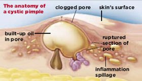 피지는 피부 밖으로 지속적으로 배출되어야만 한다. 그러나 각질이 모공을 막고 있는 상태서 피지 분비량이 증가하면 모공의 옆 부분이 피지의 압력에 의해 터지게 된다. 터진 모공 구멍을 통해 피지와 P.acne 균이 피부 속으로 퍼지면 모여드는 염증이 발생한다. 염증 반응에 의해 일어나는 붉은 점이 우리가 흔히 말하는 뾰루지이다.