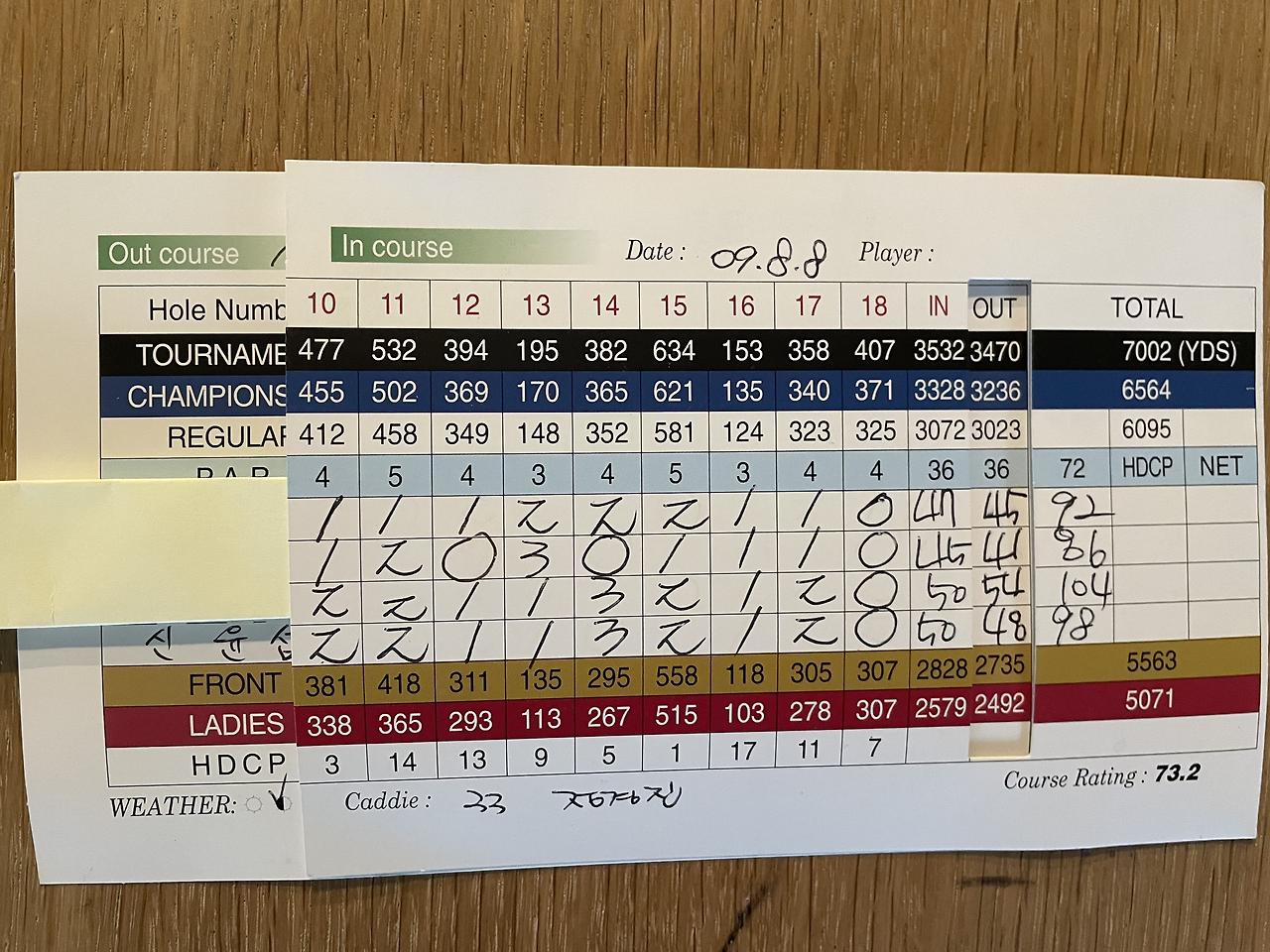 18홀 98타가 나왔다. 가방을 뒤져보니 2009년도 8월 8일 스코어 카드가 아직 남아 있다.
