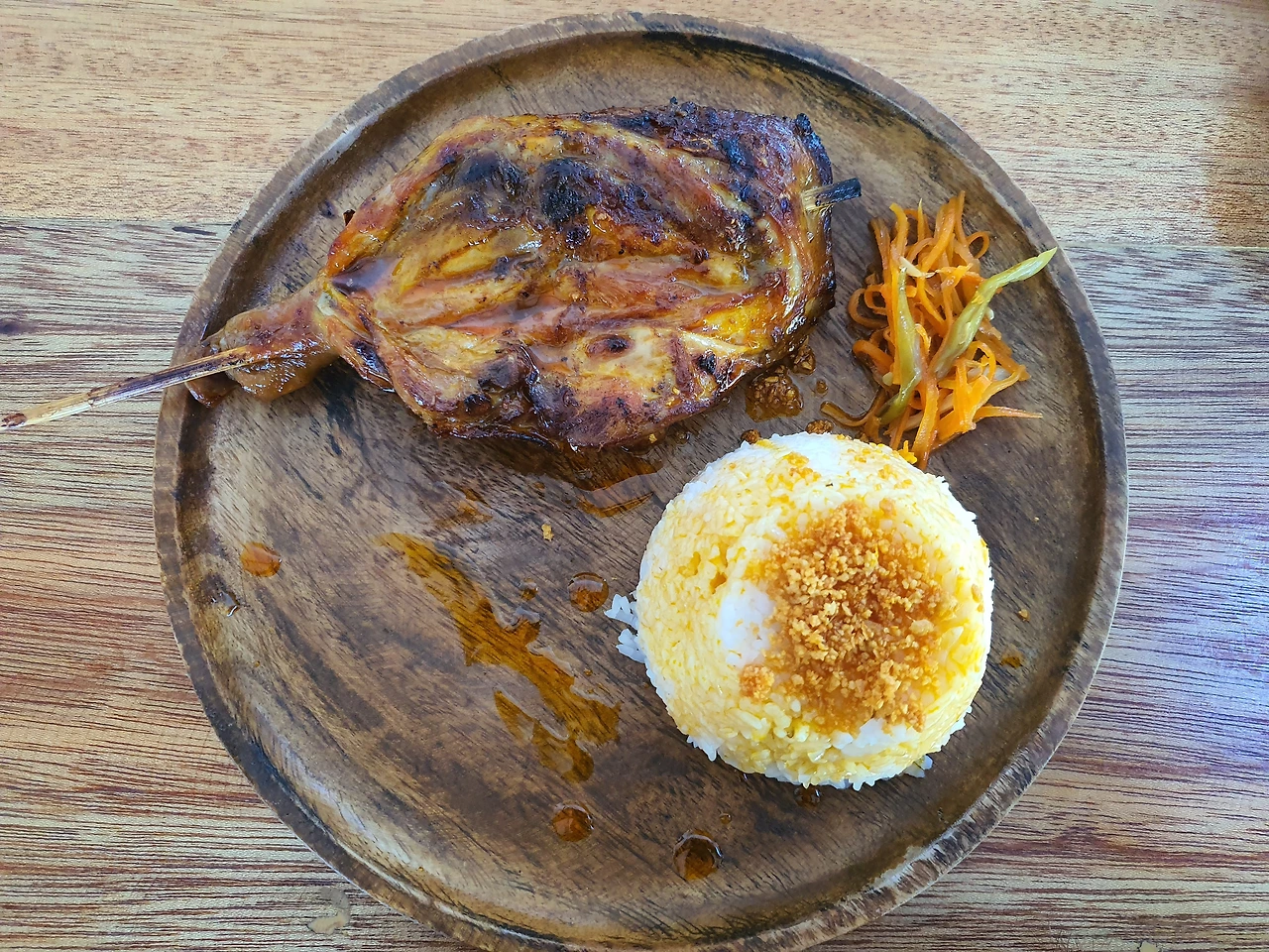 The Villiage Siargao 숙소에 묵었다. 숙소는 엄청 깨끗하고 높은 천장에 이쁜 숙소였다. 시설과 직원들의 친절도까지도 모두 만족하나, 아쉬운 점은 시내와 서핑 스폿과는 조금 거리가 있었다. 툭툭(TAXI)는 시내 내부로는 20 페소면 다 이동하나 숙소까지는 항상 50페소를 달라고 했다. 숙소와 시내는 멀지만 단순한 직진 걸이기에 스쿠터를 빌려 이동하는데 불편함이 없었다. 다행히도 호텔 카운터에서 스쿠터를 빌릴 수 있기에 첫날부터 빌리지 않은 것을 후회한 정도. 숙소에 도착 후 바로 앞에 있는 식당에서 BBQ 치킨으로 첫끼를 해결했다. 널찍한 닭다리를 숯불 위에 올리고 부채질을 하는데 그 치킨 굽는 냄새가 나의 기다리는 조급함을 배가 되게 하였다. 한적한 식당, 나무 수저, 달달달 돌아가는 선풍기, 뜨거운 공기와 빽빽한 나무 숲 풍경 그리고 생긴 것도 말하는 것도 다 다른 외국인들. 모든 것이 이국적인 여행의 첫 시작, 그저 다 좋았다.