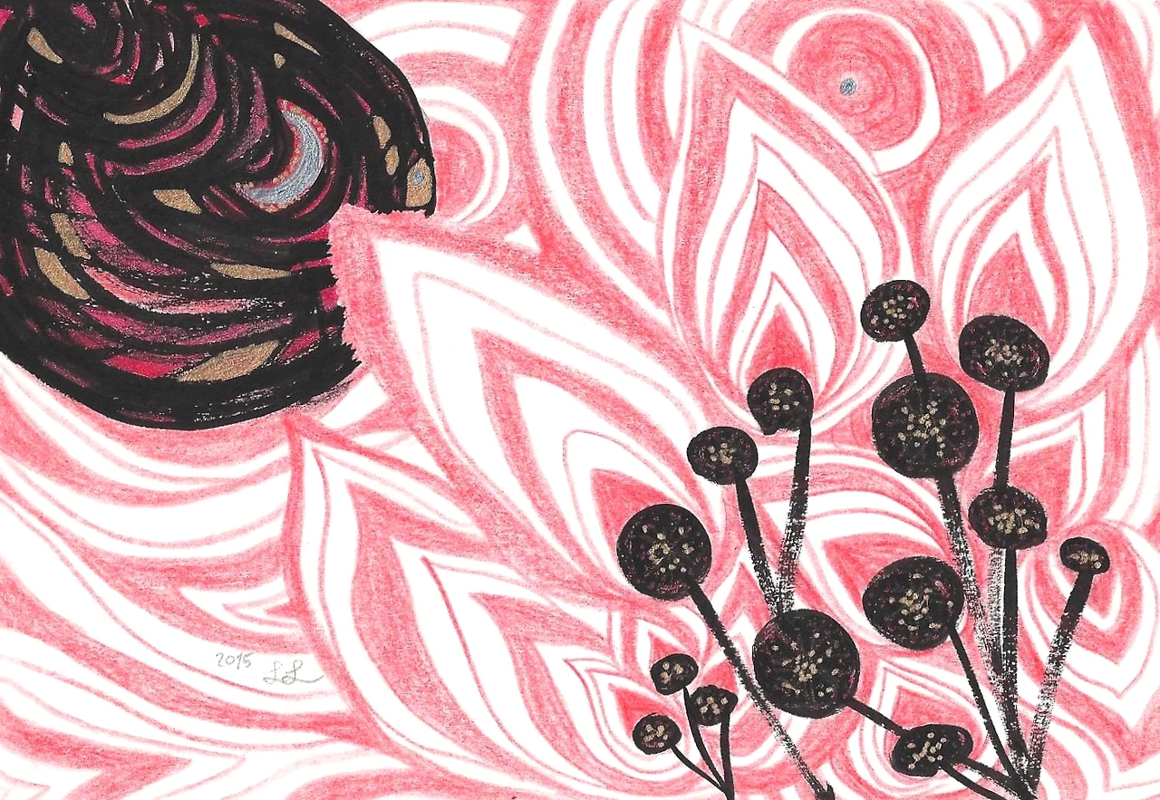오늘의 주제 ‘밤 산책’과 어울리는 그림을 그려봤어요. 새카만 밤하늘에 은은한 달빛, 그 아래 핀 새빨간 장미꽃의 아득한 향기. 이 모든 것에 압도 당하고 달뜬 제 마음을 그림으로 표현해봤어요. 제목은 <장미와 달빛>으로 붓펜과 색연필, 반짝이 펜을 이용해서 그린 그림입니다. 이질적인 재료를 한데 섞어 사용함으로써 새로운 느낌이 나지 않나요? 이렇게 최대한 다양한 조합으로 그림을 그리는 것을 좋아해요. 틀에 박힌 미술 교육을 받지 않고 그림을 그려서인지 제 머릿속의 느낌을 최대한 창의성있는 방법으로표현하는 것에 익숙한게 제 장점이고 꽤 만족스럽습니다.