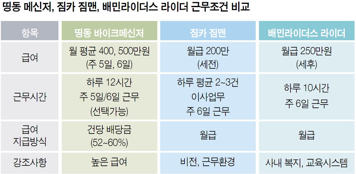 유성재 : 띵동은 주 6일, 주 5일 근무 선택이 가능하다. 하루 12시간 기준으로 주 5일 근무시 한달 평균 400만원 정도의 월급을 받는다. 주 6일 이상 할 경우 월 평균 500만원 이상 벌고 있는 메신저 또한 존재한다. 다른 배달업체에 비해 띵동 메신저는 건당 수수료가 아닌 배달요금의 일정비율을 받는다는 차이점이 있다. 처음 근무 시작할 때는 50%이며 근속 개월이 길어질수록 60%까지 상승한다. 개인적으로 띵동은 이륜차 라이더 업계 최고의 급여조건을 가지고 있다 생각한다.