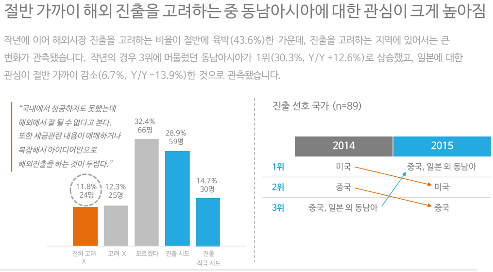 단순히 역직구 업체뿐일까요. 많은 스타트업들이 해외진출을 고민하고 있습니다. 스타트업얼라이언스와 오픈서베이가 조사한 스타트업트렌드리포트2015에 따르면 올해 해외시장 진출을 고려하고 있는 스타트업 비율은 43.6%로 절반에 육박합니다. 진출선호국가로는 동남아시아(중국, 일본 제외), 미국, 중국 순으로 나타났습니다.