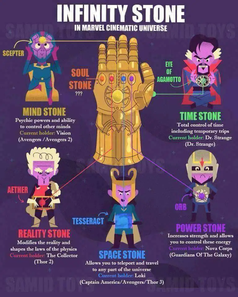 인피니티 스톤 개개의 힘은 너무도 강해서 오래토론 갖고 있으면 힘이 쇠력해지다 못해 죽게 된다. 레드스컬만 해도 스페이스 스톤의 힘을 견디지 못했고, 파워 스톤을 들고 귀환하던 스타로드도 기력이 약해져 고생을 했다. 그래서 스톤들은 목걸이나 창 같은 물체에 들어 있는 것이고 타노스조차도는 특별히 만들어진 건틀릿을 착용했음에도 왼쪽 팔이 날아갈 정도로 몸에 큰 타격을 입은 것이다.