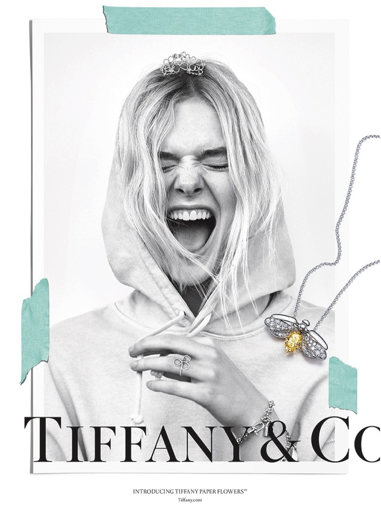 올해에는 티파니는 갓 스무살의 엘르 패닝을 모델로 영입하면서, 새로 출시한 페이퍼 플라워 컬렉션 광고에는 젊은 감각을 더더욱 많이 불어넣었다.