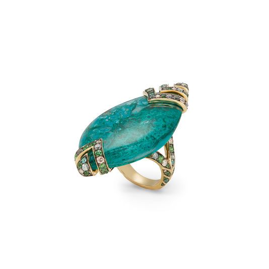 그래서 다른 주얼리 브랜드에서는 쉽게 보기 어려운 다양한 재료로 주얼리를 만드는 것을 볼 수 있다. 라피스 라줄리나 레드 재스퍼, 블랙 스피넬와 블루 토파즈 같은 젬스톤을 스털링 실버와 함께 디자인하는 과감한 색감의 사용은 에스닉하면서도 건강한 느낌을 배가한다.