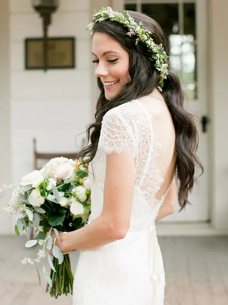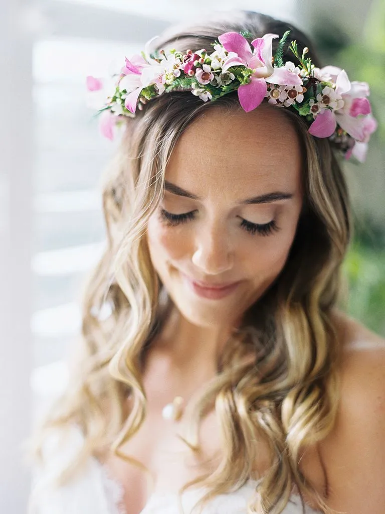 티아라 대신 화관을 쓰는 경우도 종종 있다. 야외에서 진행하는 스몰 웨딩 컨셉의 경우에 내추럴한 느낌으로 화관을 많이 쓰는 것 같다. 자연스러운 느낌의 컬이 들어간 웨이브 헤어를 한 경우에 더 따뜻하면서도 페미닌한 느낌이 들고, 레트로한 웨딩드레스와도 잘 어울린다. 부케와 같은 느낌의 조화를 선택해서 제작해보는건 어떨까.