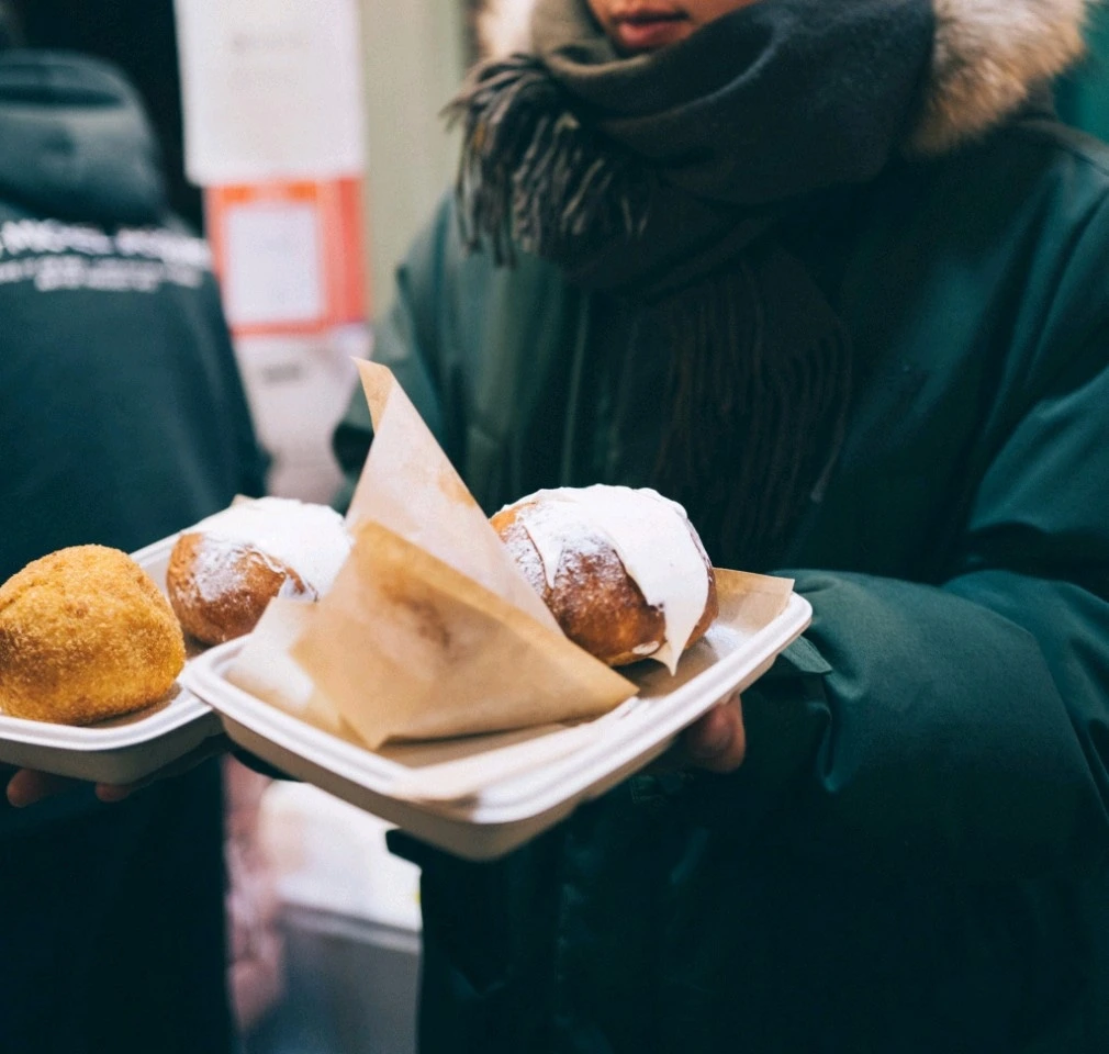 행사당일 요청분은 60인분이었으나 혹시나 몰라서 80인분을 준비했었다. 행사 당일 정말 추웠다.(체감기온 영하10도를 버티는 건 보통 일이 아니었다.) 행사는 5시부터 9시까지 4시간이었다. 한파라고 해야 영하 1도 전후인 따뜻한 남쪽섬에서 싸라기눈이나마 내린 저녁이었다. 동짓날 실외에서 서빙 복장을 입고 판매를 했다가는 판매전에 입이 돌아갈 정도 추위였으니 최대한 따듯하게 옷을 입고 판매를 했다. 가게에서 미리 아란치니를 튀겨놓고 행사장에서 오븐에 데워서 나가도록 세팅을 마쳤다. 마리또조의 브리오슈 빵은 구워놓고 마스카포네 크림도 미리 쳐서 준비를 해서 주문이 들어오면 바로 크림을 넣어서 나가는 시스템으로 준비를 했다.