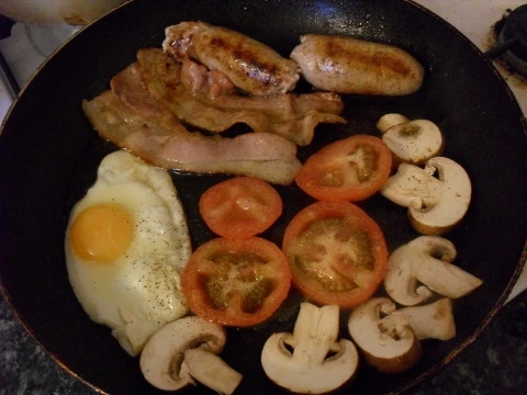 먼저 메인 음식을 만들기 위해서, 소시지, 베이컨을 준비한다. (단, 취향에 맞게 smoked 또는 unsmoked로 구입) 제일 먼저 소시지를 프라이팬에 굽는다. 불이 세면 겉이 먼저 타 버리니까 중불로 돌려주면서 약 7~8분 정도... 그리고 난 다음에 계란과 베이컨을 소시지를 옆에서~ 한 10~12분 정도 지나면 소시지, 베이컨, 계란이 적당하게 익었을 것이다. 이때, 버섯과 토마토를 올리브 오일과 후추를 조금 뿌리면서 살짝 익혀준다. 이 때 버섯과 토마토가 너무 익으면 보기에도 안 좋고, 씹는 맛이 없다. 특히 토마토의 영양소도 많이 사라진다고 하니 적당히 구워야 한다.