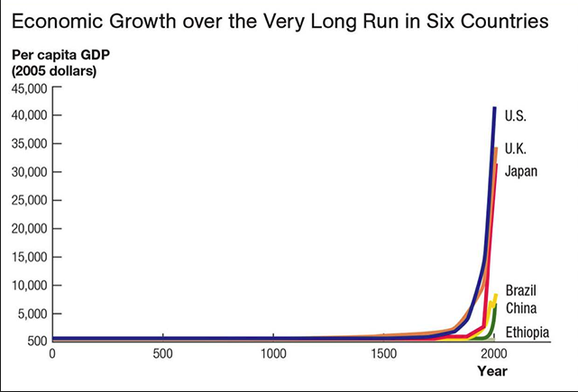 경제성장을 연구하는 학자인 Solow 는 성장의 원동력이 자본축적 이라고 주장하며, 가난한 국가도 자본의 축적을 통해 경제 강국을 따라잡을 수 있다고 바라보고 있다. 그도 기술진보가 지속적인 성장의 원천이라고 보고 있지만, 이를 하늘에서 떨어진 횡재(manna from heaven)로 취급한다는 점이 특징이다. 이와 달리, 이후 Romer 는 기술진보(technological progress)를 이끌어내는 ‘idea’를 내생적인 것(endogeneous)으로 모델에 포함시켜, 경제 성장의 원동력을 자본축적 이외에 ‘아이디어의 축적’이라 역설했다. 하지만 여기서도 아이디어의 원천에 대한 설명은 부족했는데, 이에 대해선 'Introduction to Economic Growth(2013)' 저자인 Jones 가 제도, 정치, 규범, 문화 등의 social infrastructure가 그 원천임을 주장했다.