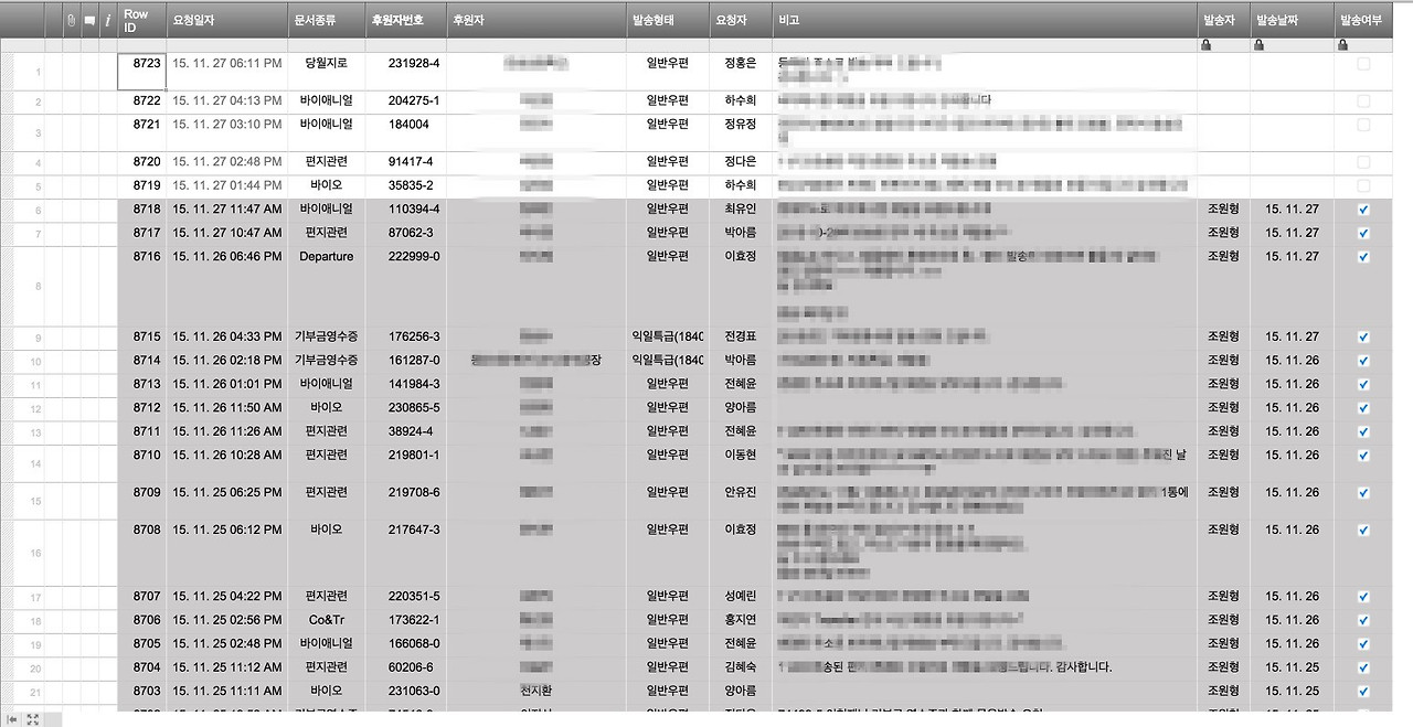이 양식은 콜센터 직원이 후원자(외부 고객)의 전화 응대를 하다가 우편물을 발송해야 할 일이 있을 때 신청하는 양식이다. 이렇게 양식에 신청을 하면 아래와 같이 요청 내역이 시트에 쌓인다. 이렇게 쌓인 요청을 우편 발송을 담당하는 직원이 확인해서 처리를 한다. 입력된 내용 외에 체크박스 등 추가로 칼럼을 만들어서 체크를 해가면서 처리를 하게 했다.