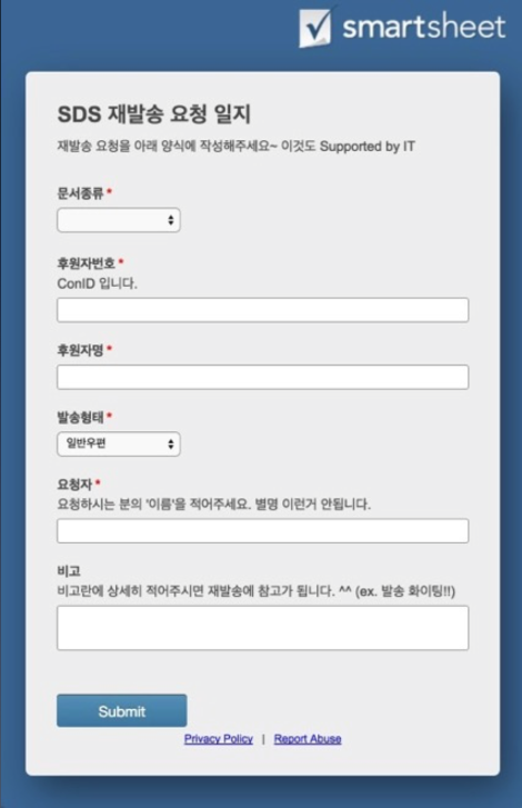 이 경우도 해결에 대한 아이디어를 줄 수 있는 경우였다. 그래서, 1) 여럿이 동시 접속이 가능한 구글 시트를 하나 만들어서 사용하는 것과 -스마트시트 활용에 대한 열정이 넘치는 시기였던지라- 2) 스마트시트로 온라인 양식을 만들어서 업무 요청을 받는 것.. 두 가지를 만들어서 제안을 했고 현업에서 스마트시트를 활용해보기로 결정을 했다. 물론 내가 사용해보고 싶어서 몰아간 부분도 있었지만.. ^^;