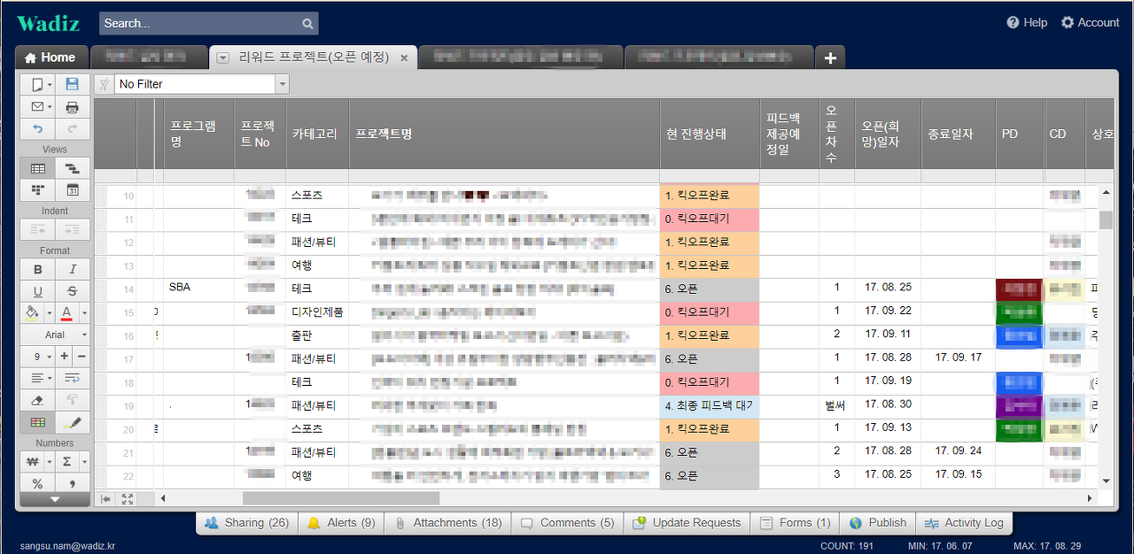 와디즈에서 스마트시트를 사용하는 것은 겉으로 봐서는 구글 시트에 비해 큰 차이가 없을 수도 있었습니다. 오히려 새로운 툴을 배우고 익숙해져야 하는 수고가 필요할 수도 있었죠. 스마트시트 사용 초기에 비슷한 이슈가 있었습니다. 어떤 분은 스마트시트가 정말 효율적인지 저한테 진지하게 물어보기도 했었습니다. 하지만 평소 ‘급변의 물살을 즐기며 앞서 나아가기’를 위해 노력하는 와디지앵들은 새로운 툴에도 금방 적응했습니다. 그리고, 다른 업무들에도 스마트시트를 사용하기 시작해서 이제는 많은 분들이 다양한 모습으로 스마트시트를 통해 협업하고 있습니다.