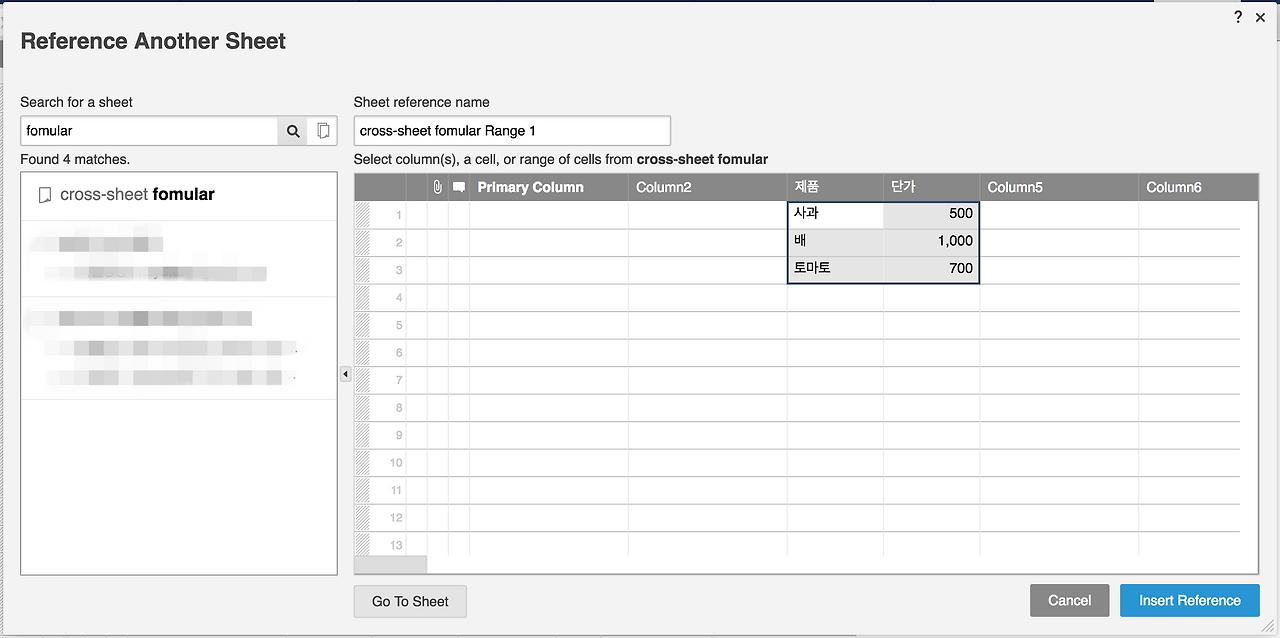 이 Reference Another Sheet 메뉴를 클릭하면 참조가 되는 시트를 찾아서 참조 범위를 지정할 수 있다.