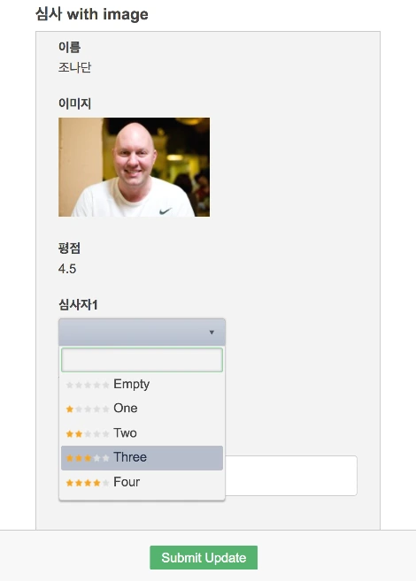 이렇게 받은 메일에서 'Open Update Form'을 클릭하면 아래와 같이 실제로 심사를 할 수 있는 화면이 나오고 심사를 할 수 있게 된다. 심사가 끝난 후에 아래에 있는 Submit Update 버튼을 누른다.