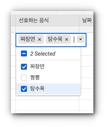 Multi Selcet가 적용된 항목은 시트에서 아래와 같이 여러 선택을 할 수 있게 된다.