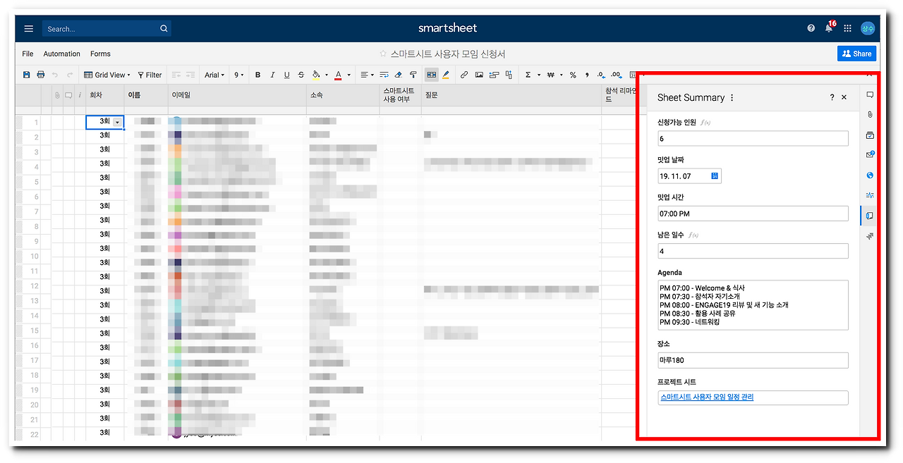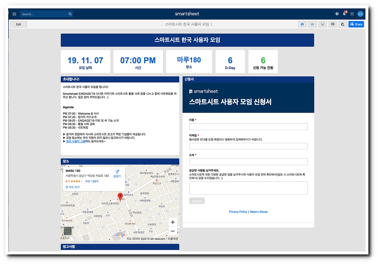2019년 스마트시트 유저 컨퍼런스인 ENGAGE'19를 다녀와서 한국 사용자 모임을 하기로 했다. 작년과 올봄에 한 번씩 사용자 모임을 했었는데, 국내에 숨어있는(?) 사용자들이 의외로 꽤 있었고 만나서 이야기 나누는 것이 즐거웠다. 그래서, 이번에도 사용자 모임을 하기로 했다. 컨퍼런스 다녀온 이야기도 나눌 겸.
