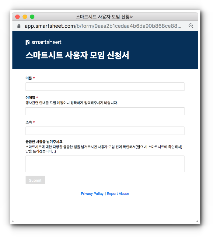 일단 사용자 모임 신청 접수를 위한 양식과 데이터가 쌓이는 시트를 만들었다. 양식이야 워낙 많이 만들어봐서 눈감고도 만들 수 있다. 처음엔 스마트시트 사용자만 신청할 수 있게 로그인 후 신청하도록 할까 하다가 너무 야박한 거 같아서 로그인 없이 신청 가능하도록 했다.