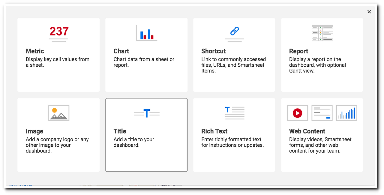 사람들이 들어와서 볼 수 있는 사이트를 만들기 위해 스마트시트에 대시보드를 하나 만들고 이 대시보드에 필요한 위젯들을 추가하기로 했다. 스마트시트 대시보드에는 다양한 형태의 위젯을 추가하여 페이지를 원하는 형태로 구성할 수 있다.