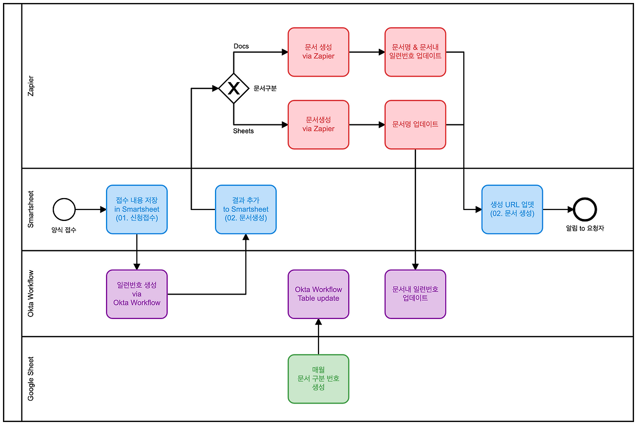 이 작업을 위해 Google Sheet, Okta workflow, Smartsheet, Zapier를 사용했다. 사실 이 flow가 최선인지 확신은 없지만 아직까진 별문제 없이 잘 사용하고 있다. 처음 요청했던 QMS 부서도 매우 만족했다. :)