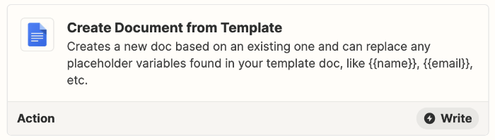생성된 문서 일련번호로 구글 문서를 생성하기 위해서는 Okta Workflow나 Zapier를 사용할 수 있다. 그런데 이번 작업에는 Okta Workflow 대신 Zapier를 사용했다. Zapier를 사용하게 된 이유는 Zapier Action에 Create Document from Template이 있었기 때문. 이 Zapier Action을 사용하면 Template으로 등록해놓은 문서 양식을 통해 문서 생성 시 문서의 제목뿐 아니라 문서 내에 특정 변수를 넣어서 값이 미리 입력된 상태로 문서를 생성할 수 있다. 문서의 일련번호를 문서 제목만이 아닌 문서 내에도 입력할 수 있는 것.