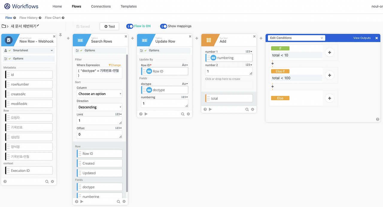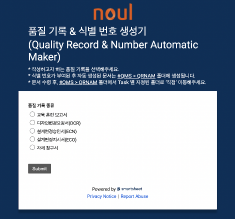 매월 1일에 Okta Workflows를 사용해서 관리하려는 각 문서의 구분 값을 문서번호-YY-MM로 table에 생성하고, Counter field를 사용하여 문서별 일련번호로 사용하면 중복 없이 문서의 일련번호를 만들 수 있었다. 사용자는 문서별 구분 번호를 알기 어렵기 때문에 문서 종류를 선택 후 신청하기 위한 양식을 스마트시트로 만들어 제공했다.