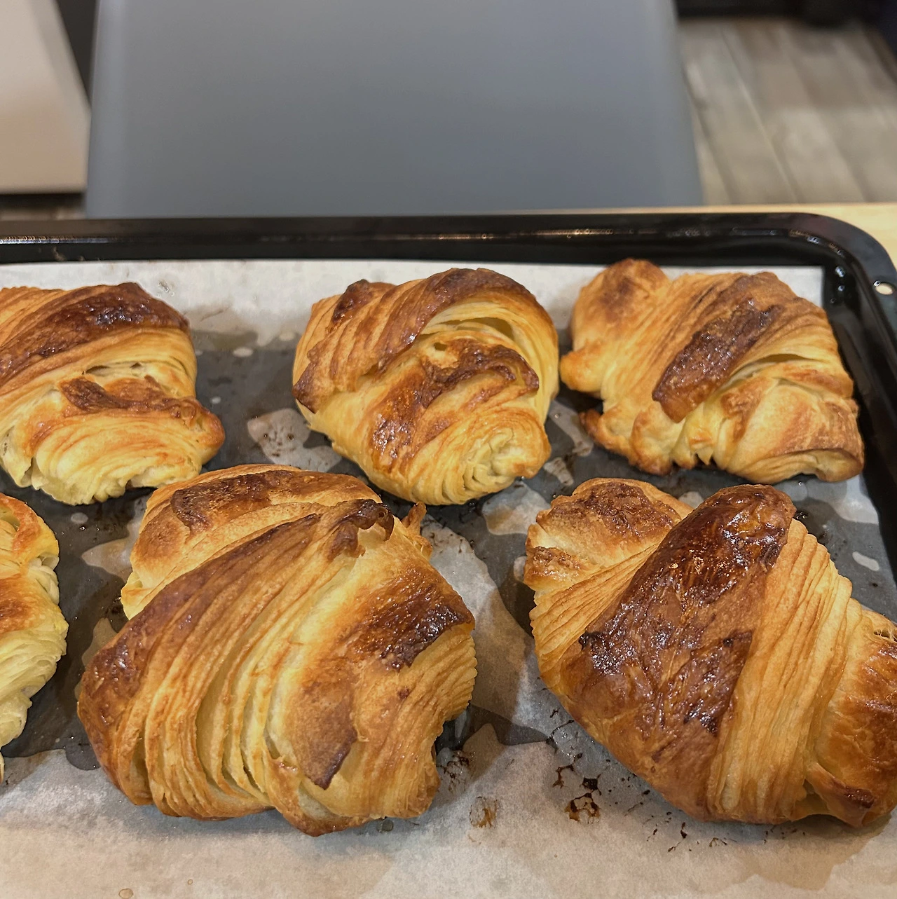 버터가 끓고 반죽이 부풀며 그동안 눌려 있던 겹들이 한꺼번에 일어난다.