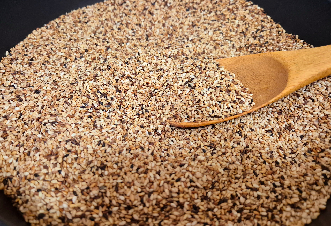 참깨를 물에 담가 손으로 살살 휘저어 씻는다. 고운 체로 참깨를 거르며, 참깨와 함께 섞여 있던 흙이 가라앉기를 기다린다. 떠오르는 티끌도 걷어낸다. 걸러낸 참깨의 물을 뺀 다음, 큰 냄비에 넣고 중간 불에 올려놓는다. 나무주걱으로 축축한 참깨를 젓기 시작한다. 냄비가 달아오르고 참깨 위로 아지랑이가 피어오르듯 수분이 날아간다.