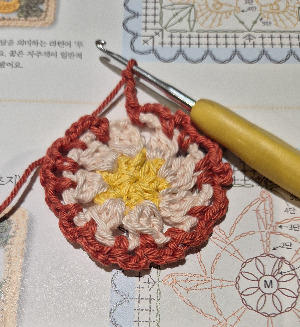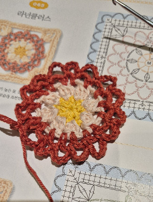 나는 참고하는 책**의 도안을 보고 노랑과 주황이 배색된 꽃을 완성했다.