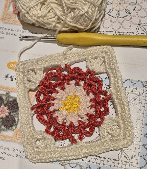 어깨가 뻐근해지고, 눈알은 빠질 것 같고, 코바늘 잡은 손가락에 통증까지 생겨 마지막 봄꽃모티브 4개를 남겨두고 그만 멈추었었다.