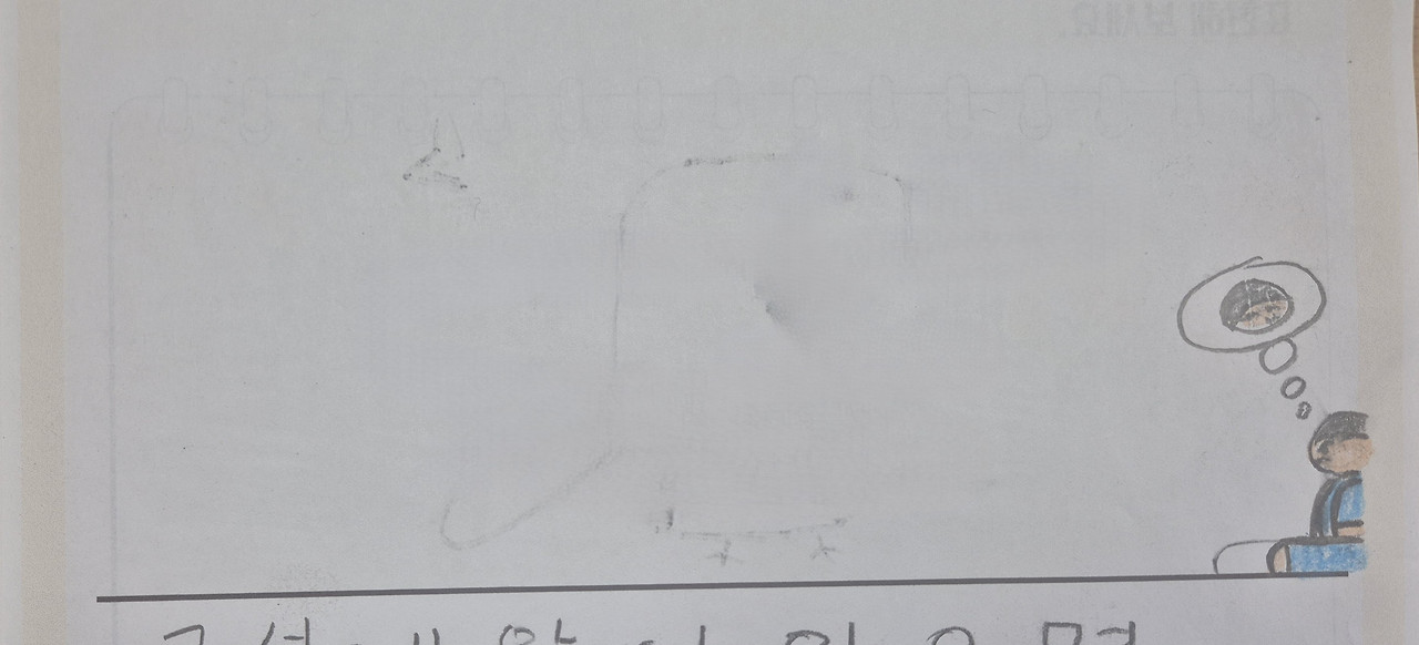 '구석에 앉아 있으면 화가 풀린다'며 활동지 저 구석에 조그맣게 자신을 그려놓은 청록이의 그림을 본다. 경직된 몸, 추켜올린 눈썹의 청록이는 구석에 앉아 웃는 모습을 상상하며 화가 풀리기를 기다리고 있다.