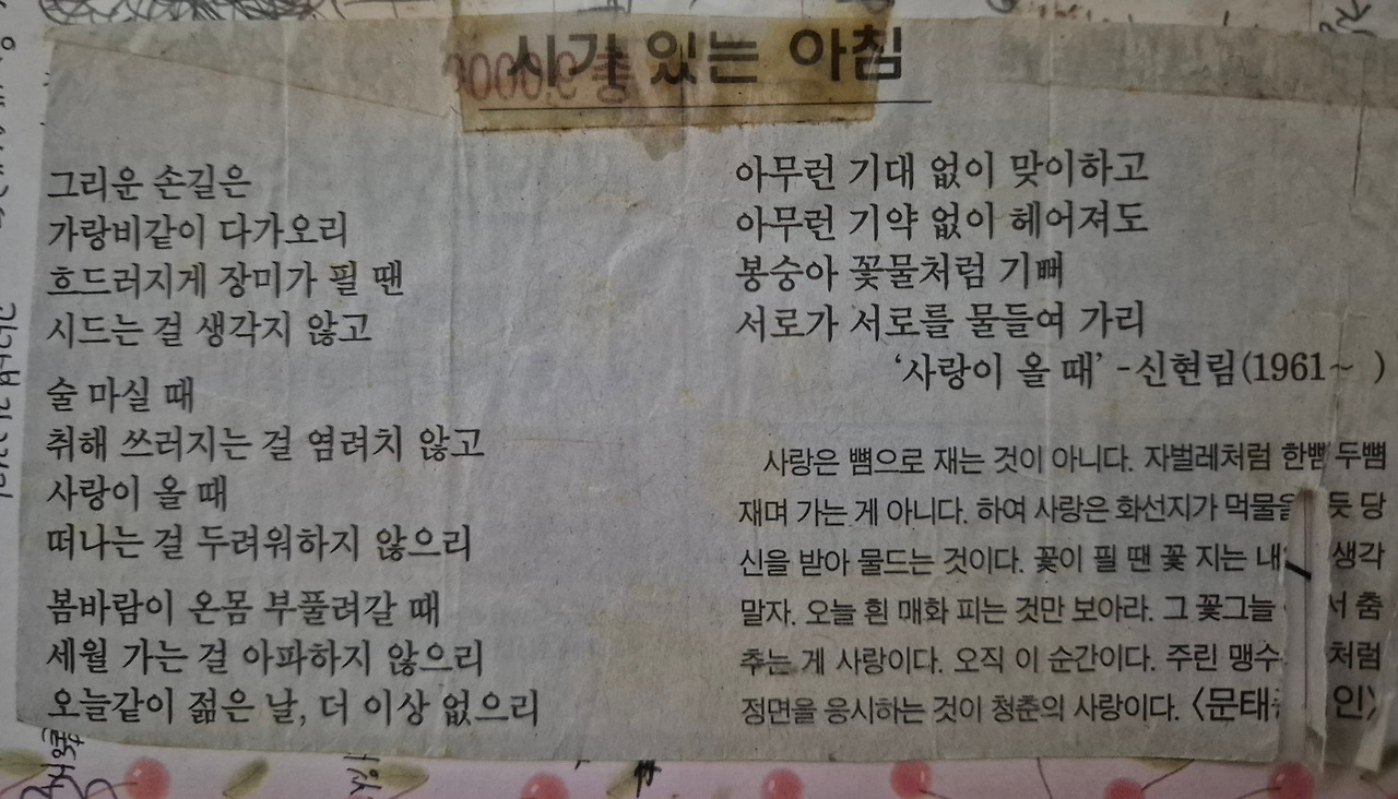 '부장들 화합이 잘되어야 학교가 잘 굴러간다'며 주말 낀 일박이일 친목여행(대부분 원치 않던)을 가게 되면, 저녁식사에 한잔 술(아니 여러 잔)을 마시고 나는 시를 낭송했다. 한 사람씩 장기자랑 비슷한 것을 해야 되는 순서였다. 그때 좋아서 열심히 읊은 시가 바로