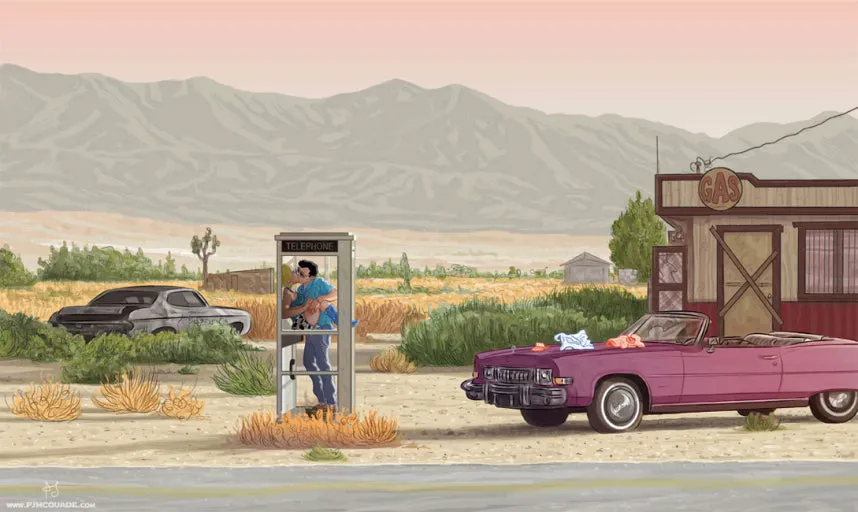 또한 주인공들이 여행을 떠날 때 쓰인 1976년형 보라색 캐딜락 역시 주연 못지않은 강력한 인상을 주었다. 모델명은 엘도라도 컨버터블 미국에서 만든 자동차 중 가장 큰 전륜구동 자동차로 당시 도로 위에 매트리스 라 불릴 만큼 거대하고 안락한 자동차였다. 배기량에 비해 낮은 출력, 낮은 연비 때문에 비교적 빠르게 역사 속으로 사라져 버린 이 차는 한 때 앨비스의 차로도 유명하였다.
