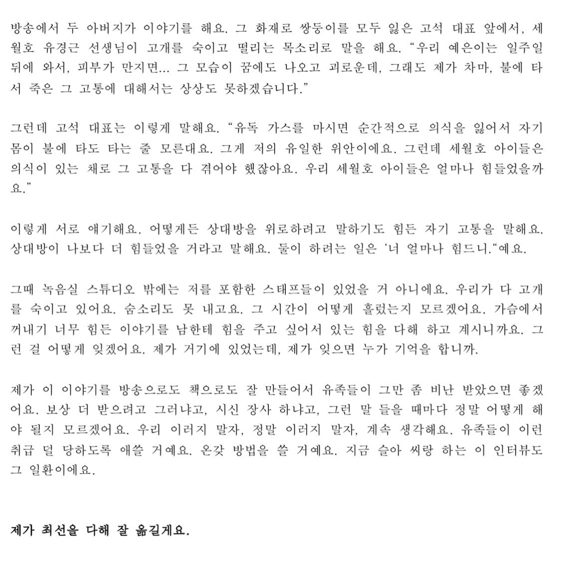 나는 내가 여전히 이 이야기에 눈물을 쏟고, 함께 눈물을 흘리는 사람들이 있어서 너무 다행이라고 생각했다. 앞으로도 계속 울 수밖에 없을 것이라고, 기억하고 잊지 않기 위해서.