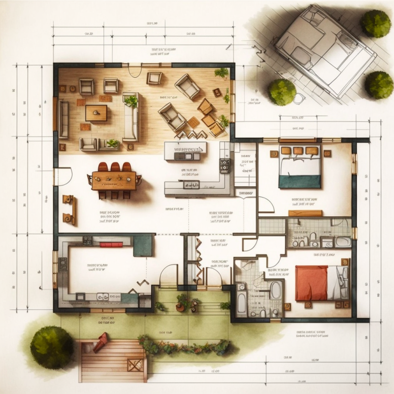 AI 프로그램 Midjourney로 만든 이미지: "층별 계획 스케치를 만들고, 층별 계획에 대한 측정과 크기를 포함하여 한 층에서 건축된 집의 계획을 만들어보세요. 두 개의 침실, 세 개의 욕실, 주방, 거실과 정원을 포함해보세요. 가구를 포함해보세요." Sean Ellul