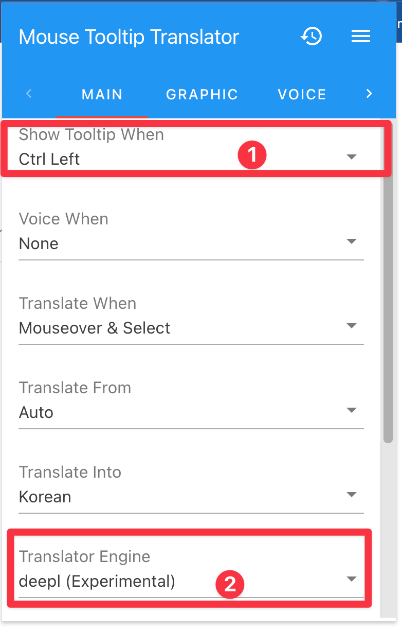1번에서 언제 번역이 표시될지를 설정합니다. Always를 하면 영어만 보이면 한국어로 번역을 해주는데 가끔 성가시기도 하여, 저 같은 경우는 왼쪽 Ctrl버튼을 누른 채로 마우스를 가져갔을 때, 번역이 되게 설정을 했습니다.