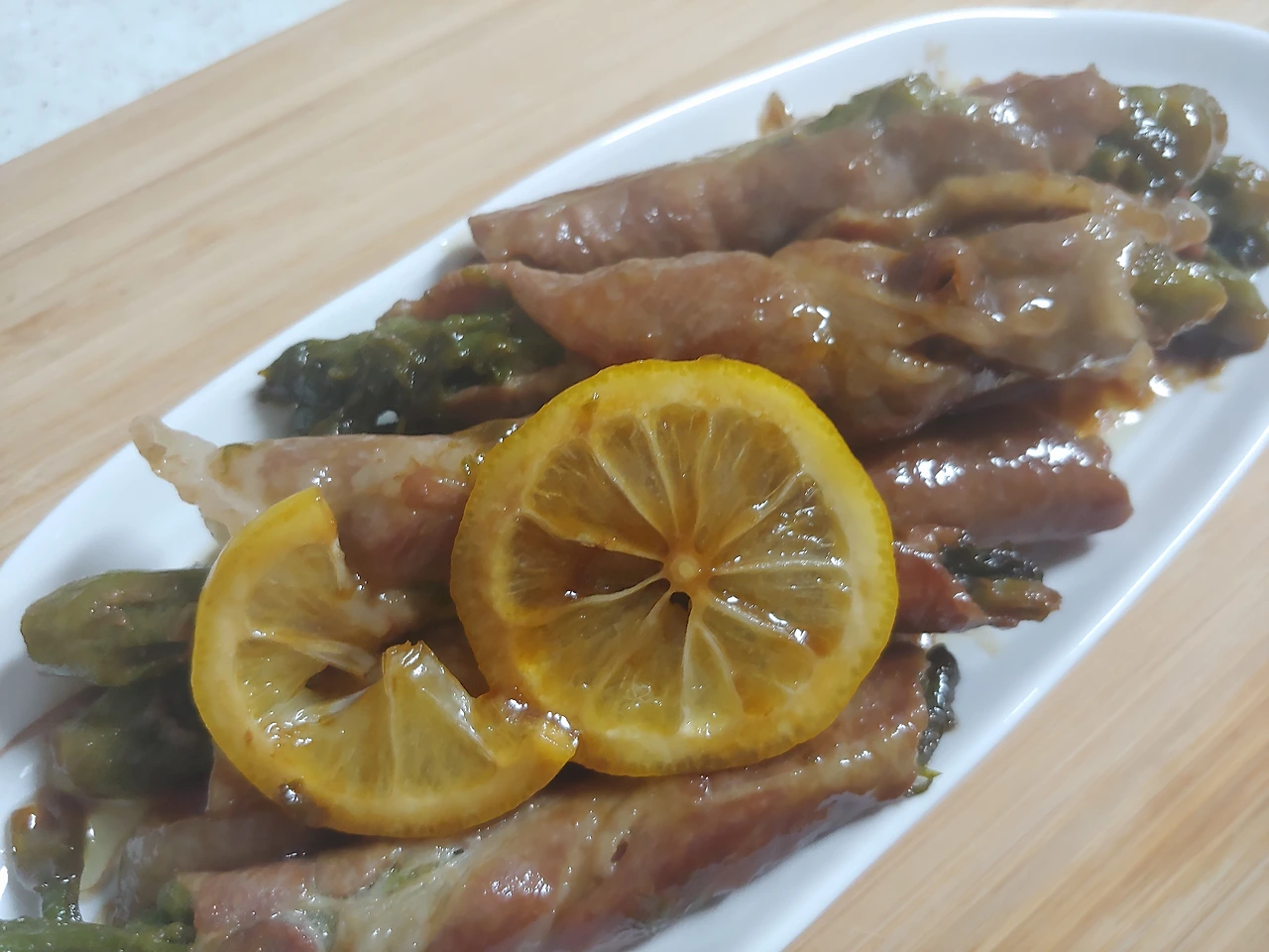 두릅을 고기 위에 놓고 말아서 프라이팬에 중불로 구워줍니다. 불이 너무 세면 금새 타버리더라구요. 소스는 꿀 한스푼에 간장 두 스푼을 섞어서 준비했는데 나중에 먹어보니 많이 달고 짭짤해서 조금 줄이는 게 좋을 것 같아요. 아니면 물을 한 스푼 섞어서 소스가 타지 않지 해도 좋을 것 같구요. 향을 더할 것을 고민하다가 후추는 너무 강할 것 같아서 후추 대신 레몬을 한 조각 썰어 넣었습니다. 레몬향이 전체적인 풍미를 끌어 올려주더라구요.