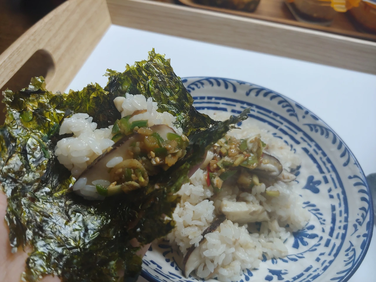 예전에 고기나 간장을 같이 넣어서 솥밥을 해 보기도 했는데 제 입맛에는 들기름만 넣어 향을 살린 이 스타일이 제일 맛있었어요. 여기에 양념간장을 올려서 김에 싸 먹으면 진짜 소고기 살치살 못지않게 고소하고 쫄깃한 표고버섯 밥이 됩니다. 맛있다고 양껏 먹다가 배가 부르니 후...또 소화가 안되는 것 같네요. 인간의 욕심은 끝이 없고 같은 실수를 반복한다고 하더니...