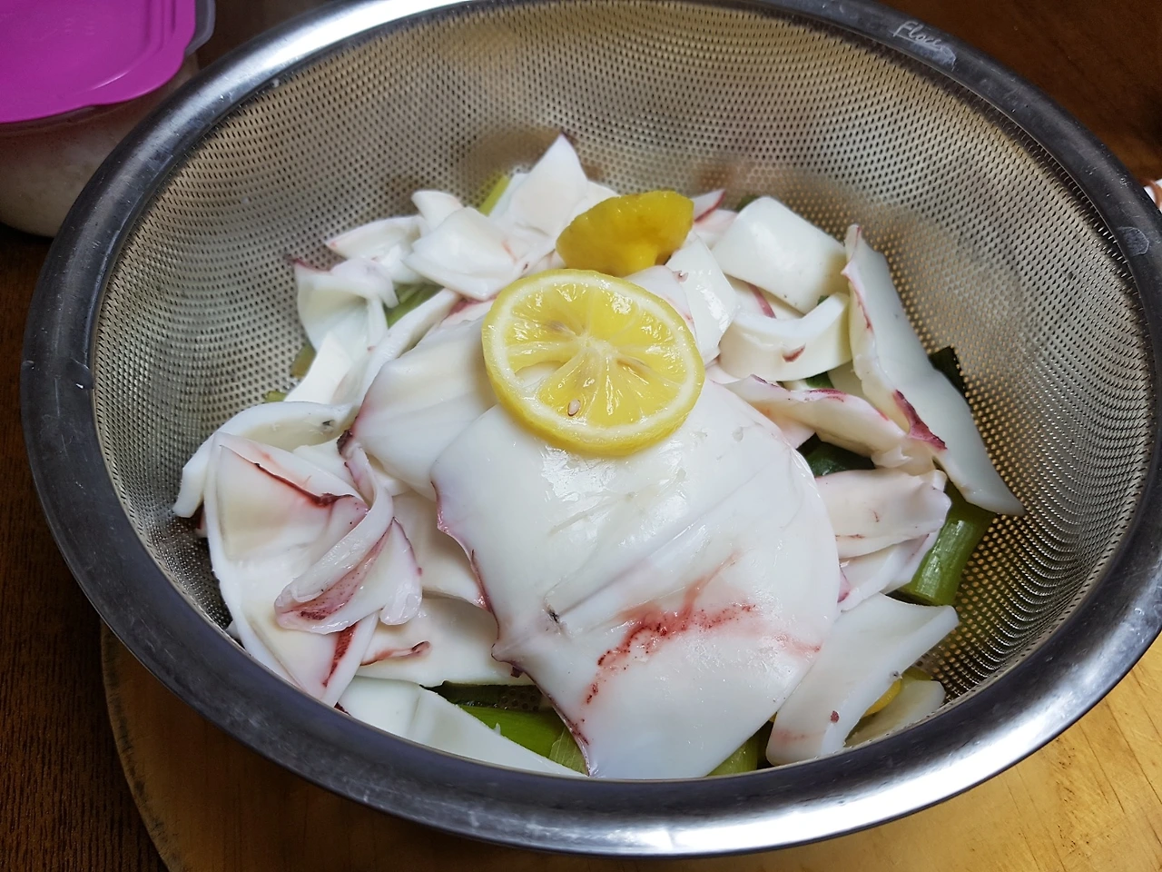 동생이 한치를 대파와 같이 찌는 게 어떻겠냐는 아이디어를 줬어요. 그럼 대파받고 레몬 하나 추가! 대파는 엄지손가락 길이로, 레몬은 편을 썰어 찜기에 깔아주고 그 위에 뽀얗게 속살이 드러난 한치의 몸통을 올려줍니다. 물이 팔팔 끓을 때 재료를 찌기 시작해서 6분, 불을 끄고 10분쯤 뜸을 들였어요.