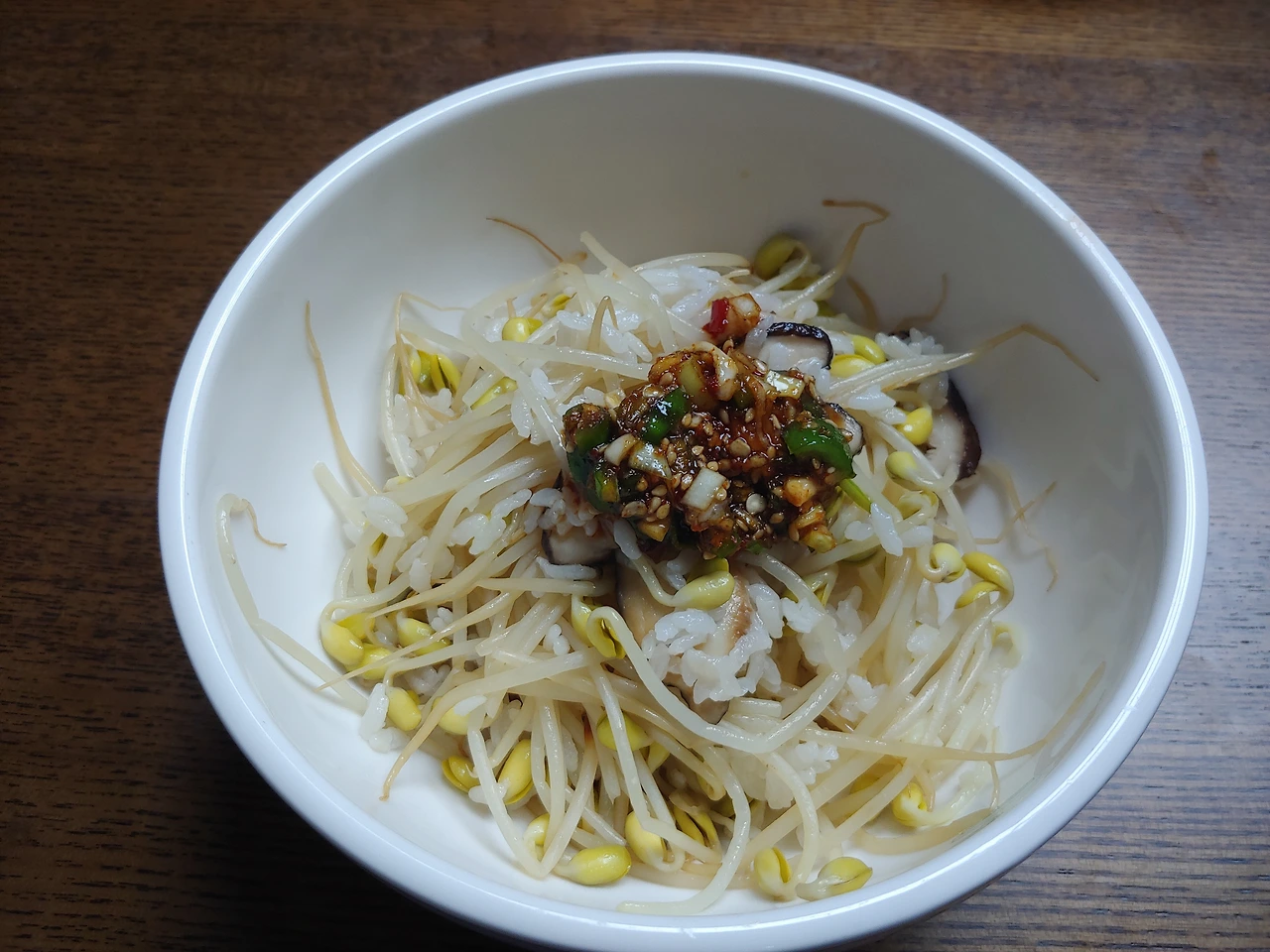 지난번에 표고버섯 솥밥을 하고 남은 표고버섯을 채 썰어서 같이 넣어 줬어요. 냄비에 들기름을 조금 넣고 표고버섯을 볶다가 불려놓은 쌀을 넣고 물을 부어서 한소끔 끓여준 후에 콩나물을 얹고 약불로 줄입니다. 압력솥이나 전기밥솥에 콩나물 밥을 하면 콩나물을 처음부터 넣고 끓이는데, 그렇게 하면 콩나물이 질겨져서 맛이 없어요. 전 콩나물 밥은 무조건 냄비에 해야 한다고 생각해요. 콩나물이 다 익을 때까지 시간을 충분히 써야 하기 때문에 평소보다 밥하는 시간이 조금 더 걸릴 수 있어요. 이때 콩나물밥 양념장은 만드는 데 다진 마늘, 다진 파에 간장, 고춧가루, 참기름, 통깨를 넣으면 끝입니다. 아까 만든 두부 양념장에서 단맛을 뺀다고 생각하면 쉽죠?