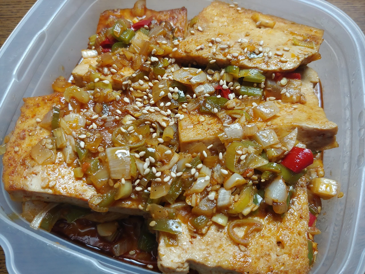 물기를 제거한 두부를 식용유를 두른 팬에 올려 노릇하게 구워 줍니다. 자주 뒤집으면 두부가 부스러지니 중불로 천천히 구우면서 한 번씩만 뒤집으면 됩니다. 양념장에는 다진 파 한 대, 다진 마늘 한 스푼, 다진 양파 반개에 피망이 있으면 조금 넣어도 좋아요. 재료는 다 잘게 다져 주세요. 거기에 고춧가루 한 스푼, 간장 2스푼, 굴소스 1스푼, 매실청 1스푼, 물엿 1스푼, 들기름이나 참기름을 조금 넣고 섞어줍니다. 짠맛은 간장과 굴소스가 내주고 단맛은 매실청과 물엿이 담당하니 입맛에 따라 조절하면 되겠죠? 통깨도 있으면 술술 뿌려주고 타지 말라고 물도 반 컵 넣고 은은한 불로 졸여줍니다. 국물이 졸아드는 동안 콩나물 밥을 하면 되겠어요.