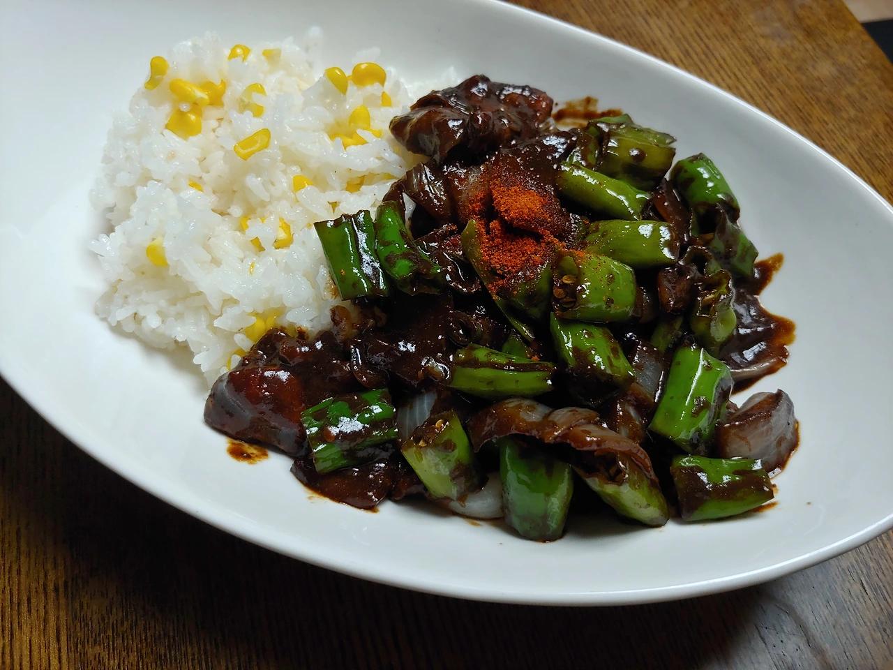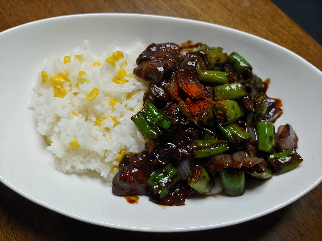근데 이 음식은 매운 맛에 약한 분들은 힘들거예요. 기름지고 묵직한 짜장의 맛을 꽈리고추가 아삭하게 씹히면서 개운하게 입안을 씻어주면 뒤늦게 청양고추의 매운맛이 입안에 퍼지거든요. 매운 입을 달래주는 계란국을 준비해서 같이 먹거나 오이냉국이 곁들이면 좋을 것 같어요. 그래도 담백한 돼지고기 뒷다리살과 아삭한 꽈리고추, 달콤한 양파가 잘 어울려서 물을 벌컥벌컥 마시면서도 끝까지 다 먹었어요. 초당옥수수밥이 달콤해서 이 매운맛을 견디게 도와줍니다.