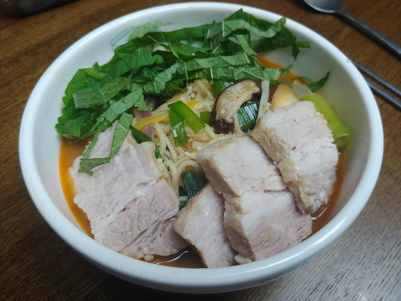 육수에 면넣고 바로 채소 넣어서 같이 끓여줍니다. 채소는 팽이버섯 조금, 표고버섯 두개, 애호박 반개, 부추 한 줌, 대파 한 줌 넣었어요. 다진 마늘 한 스푼 크게 떠서 넣고 간을 봅니다. 짜면 물 보충, 싱거우면 새우젓 조금. 한소끔 끓는 동안 청양고추 한개 채 썰어 넣고요, 깻잎도 조금 가늘게 채 썰어서 고명으로 쓰려고요. 남은 삼겹살 수육도 얇게 썰어서 차곡차곡 면 위에 올려줄 거예요.